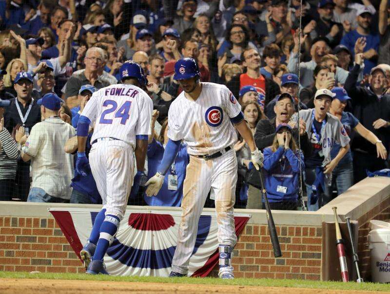 Chicago Cubs center fielder Dexter Fowler (24) is greeted at home by Kris Bryant after his home run in the eight inning during Game 1of baseball's National League championship series against the Los Angeles Dodgers, Oct, 15 2016, at Wrigley Field in Chicago.