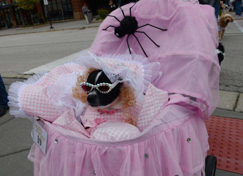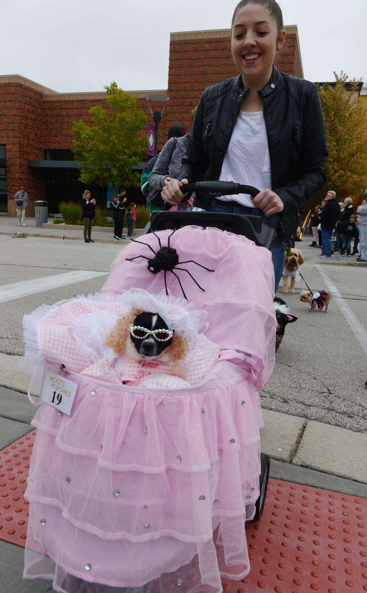 Hannah McAlpin of Elgin pushes her "Little Miss Muffet" dog Minnie during the pet parade of the fifth annual Hoots and H'Owls at Randhurst Village in Mount Prospect Saturday.