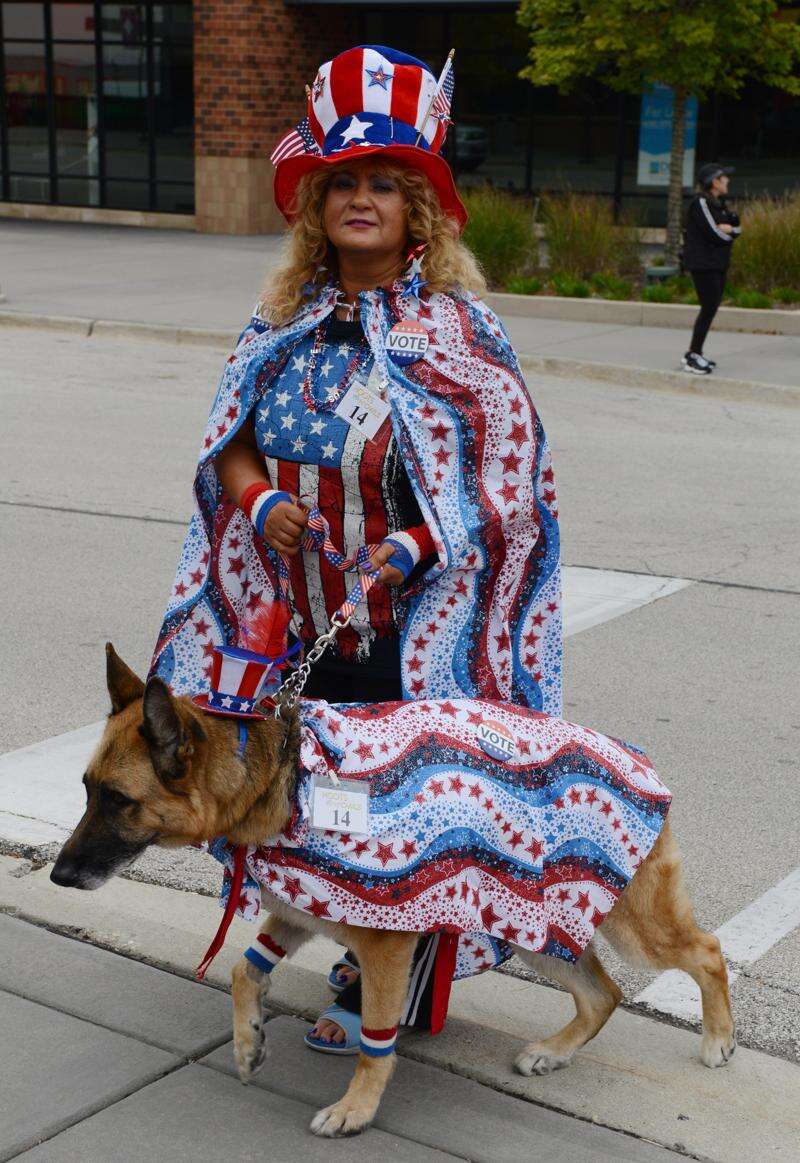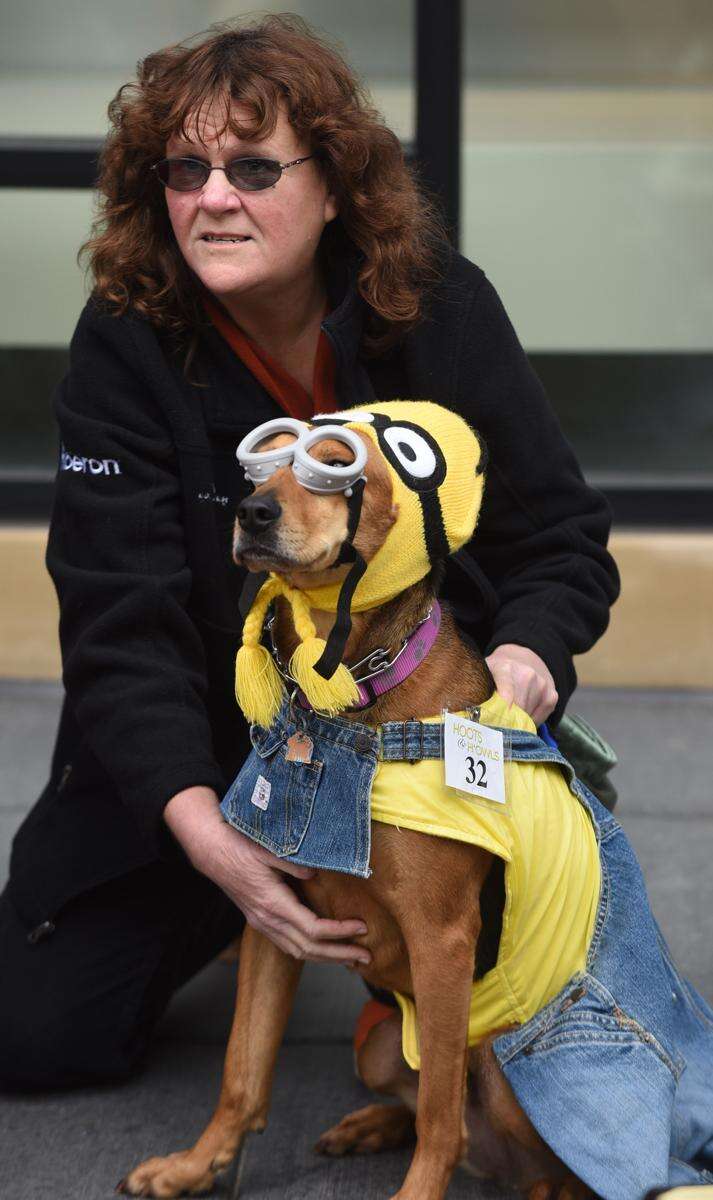 Debbie Holme of Carpentersville and her Minion dog Kie get ready to take the stage during the pet parade of the fifth annual Hoots and H'Owls at Randhurst Village in Mount Prospect Saturday.