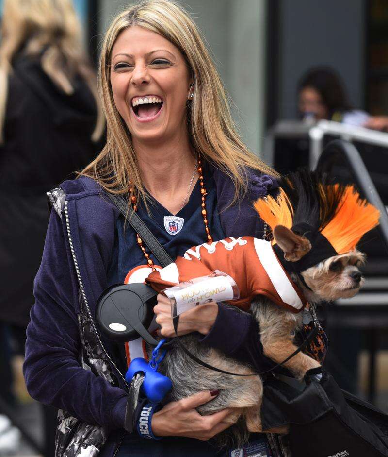 Nikki Clair of Des Plaines carries her Bears football dog Tanner during the pet parade of the fifth annual Hoots and H'Owls at Randhurst Village in Mount Prospect Saturday.