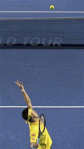 Japan's Kei Nishikori serves to Serbia's Dusan Lajovic during their first round match at the Swiss Indoors tennis tournament at the St. Jakobshalle in Basel, Switzerland, on Monday, Oct. 24, 2016. (Georgios Kefalas/Keystone via AP))