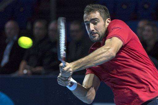 Croatia's Marin Cilic returns a ball to Russia's Mikhail Youzhny in action during their first round match at the Swiss Indoors tennis tournament at the St. Jakobshalle in Basel, Switzerland, on Monday, Oct. 24, 2016. (Georgios Kefalas/Keystone via AP)