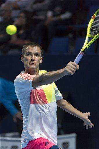 Russia's Mikhail Youzhny returns a ball to Croatia's Marin Cilic during their first round match at the Swiss Indoors tennis tournament at the St. Jakobshalle in Basel, Switzerland, on Monday, Oct. 24, 2016. (Georgios Kefalas/Keystone via AP)
