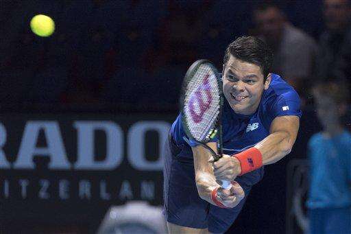 Canada's Milos Raonic returns a ball to Lithuania's Ricardas Berankis during their first round match at the Swiss Indoors tennis tournament at the St. Jakobshalle in Basel, Switzerland, on Tuesday, Oct. 25, 2016. (Georgios Kefalas/Keystone via AP)