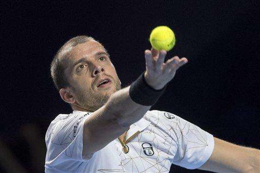 Luxembourg's Gilles Muller serves a ball to Bulgaria's Grigor Dimitrov during their first round match at the Swiss Indoors tennis tournament at the St. Jakobshalle in Basel, Switzerland, on Tuesday, Oct. 25, 2016. (Georgios Kefalas/Keystone via AP)
