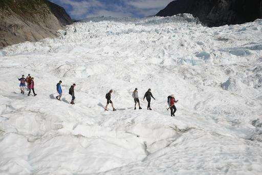 FILE - In this Feb. 6, 2016 file photo, tourists who have taken a helicopter trip onto the Fox Glacier follow a guide in New Zealand. In New Zealand there are twice as many cows as people, but it’s the hobbits that are really making hay. According to figures released Wednesday, Oct. 26, 2016, tourism has overtaken dairy as the nation’s top earner of overseas dollars. And tourism officials say the success of the fantasy movie trilogy “The Hobbit” has helped. (AP Photo/Nick Perry, File) The Associated Press