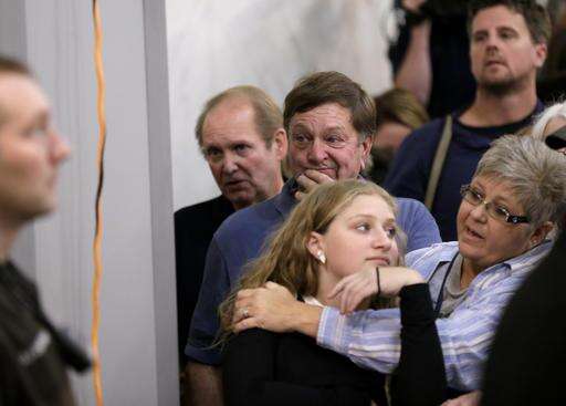Family, friends and members of the media, including Brad Waite, center, brother of murdered Shirlee Sherman, wait to be admitted into the Douglas County Courtroom in Omaha, Neb., Wednesday, Oct. 26, 2016, to hear the jury verdict in the trial of former doctor Anthony Garcia, who was found guilty of four counts of first-degree murder for killing four people with ties to the Creighton medical school that fired him in 2001. He now faces either life in prison or death - if voters opt on Nov. 8 to keep Nebraska's death penalty. (AP Photo/Nati Harnik)