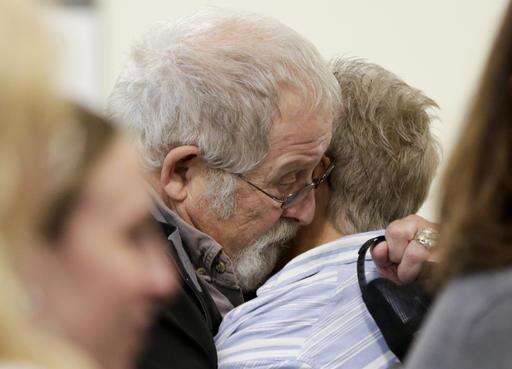 Mike Sherman, left, husband of murder victim Shirlee Sherman, hugs an unidentified person outside the Douglas County Court in Omaha, Neb., after the Douglas County jury found Anthony Garcia, a former doctor, guilty of four counts of first-degree murder for killing Shirlee and three others with ties to the Creighton medical school that fired him in 2001. Garcia now faces either life in prison or death - if voters opt on Nov. 8 to keep Nebraska's death penalty. (AP Photo/Nati Harnik)