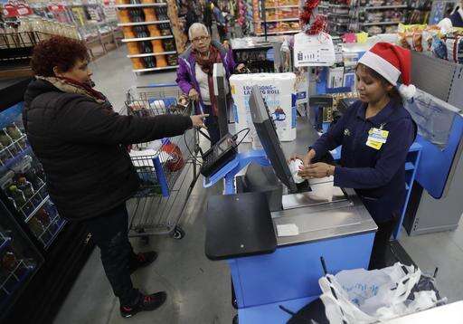 In this Wednesday, Oct. 26, 2016, photo, Gladys Ortega, left, and Ursula Polano, center, both from Paterson, N.J., check out at the register of Dimpal Mandania, at Wal-Mart in Teterboro, N.J. Wal-Mart may be known for its every low prices but this holiday season it wants to be known for service too. (AP Photo/Julio Cortez) The Associated Press
