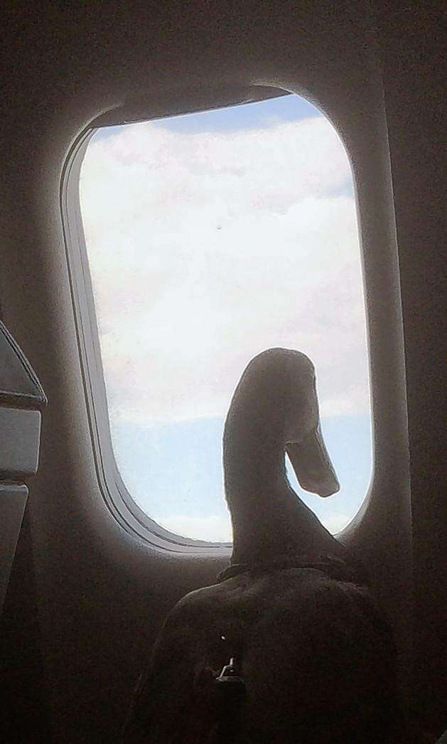 Like many other passengers, Essig snapped a few photos while Daniel and his human were boarding. After takeoff, Essig tried to concentrate on light reading during the flight, but he kept inadvertently glancing toward the duck, just a row ahead and to the right of him.