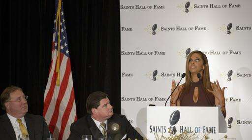 Looking up to the heavens, Racquel Smith speaks to her husband, slain New Orleans Saints defensive end Will Smith, and tells him that she is proud of him, at the New Orleans Saints Hall of Fame luncheon in Kenner, La., Friday, Oct. 28, 2016. Dennis Lauscha, left, president of the Saints, and Ken Trahan, a sportswriter and master of ceremonies, listen. (Matthew Hinton/The Advocate via AP) The Associated Press