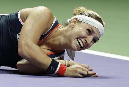 Slovakia's Cibulkova rolled to the ground in celebration after taking her debut at the WTA Finals all the way to the championship match with a 1-6, 7-6 (2), 6-4 semifinal victory over Svetlana Kuznetsova.