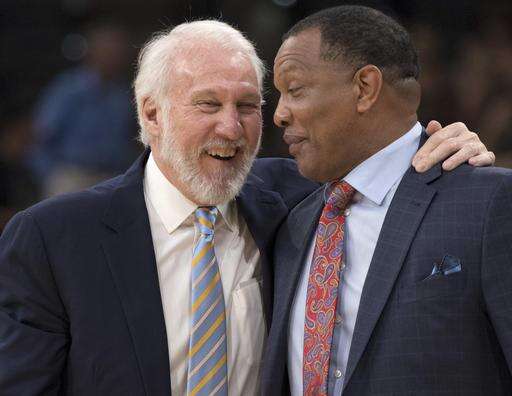 San Antonio Spurs head coach Gregg Popovich, left, and New Orleans Pelicans head coach Alvin Gentry talk on the court after an NBA basketball game, Saturday, Oct. 29, 2016, in San Antonio. San Antonio won 98-79. (AP Photo/Darren Abate) The Associated Press