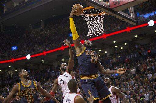 Cleveland Cavaliers forward LeBron James scores as Toronto Raptors forward DeMarre Carroll, center left, defends during the second half of an NBA basketball game in Toronto on Friday, Oct. 28, 2016. (Chris Young/The Canadian Press via AP) The Associated Press
