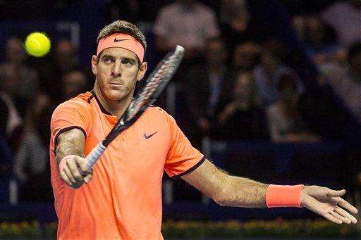 Argentina's Juan Martin Del Potro in action against Japan's Kei Nishikori during their quarterfinal tennis match at the Swiss Indoors tennis tournament in Basel, Switzerland, on Friday, Oct. 28, 2016. (Alexandra Wey/Keystone via AP)