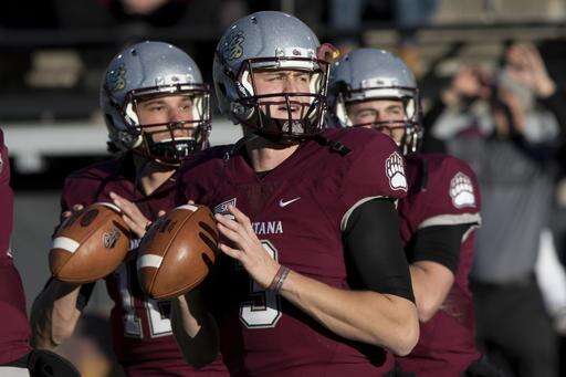 Montana quarterback Brady Gustafson, center, warms up with his teammates before playing Idaho State in an NCAA college football game Saturday, Nov. 5, 2016, in Missoula, Mont. (AP Photo/Patrick Record) The Associated Press