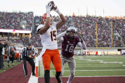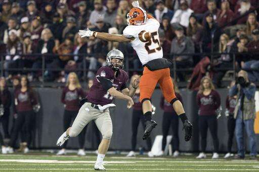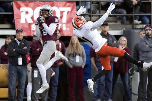 Idaho State wide receiver KW Williams (15) catches a touchdown pass over Montana cornerback JR Nelson (18) in the first half of an NCAA college football game Saturday, Nov. 5, 2016, in Missoula, Mont. (AP Photo/Patrick Record) The Associated Press