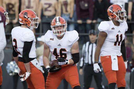 Idaho State tight end Austin Campbell (46) celebrates after scoring a touchdown against Montana in the first half of an NCAA college football game Saturday, Nov. 5, 2016, in Missoula, Mont. (AP Photo/Patrick Record) The Associated Press