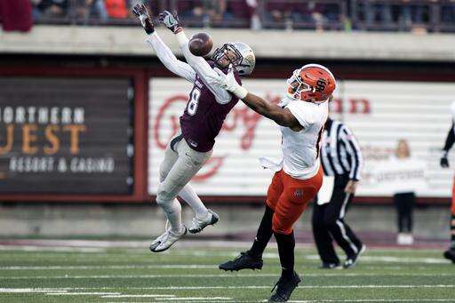 Montana cornerback JR Nelson (18) breaks up a pass intended for Idaho State wide receiver KW Williams (15) in the first half of NCAA college football game Saturday, Nov. 5, 2016, in Missoula, Mont. (AP Photo/Patrick Record) The Associated Press