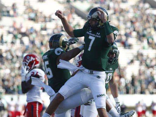Colorado State quarterback Nick Stevens, right, celebrates with running back Izzy Matthews after he rushed for a touchdown against Fresno State in the second half of an NCAA college football game Saturday, Nov. 5, 2016, in Fort Collins, Colo. Colorado State won 37-0. (AP Photo/David Zalubowski)