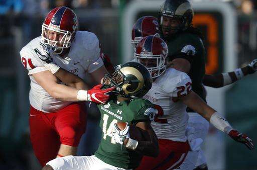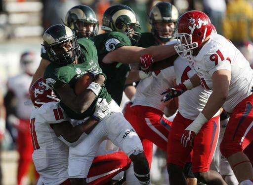 Colorado State running back Marvin Kinsey Jr., center, is tackled by Fresno State defensive back DeShawn Potts, left, as defensive lineman Nathan Madsen joins in the stop in the second half of an NCAA college football game Saturday, Nov. 5, 2016, in Fort Collins, Colo. Colorado State won 37-0. (AP Photo/David Zalubowski)