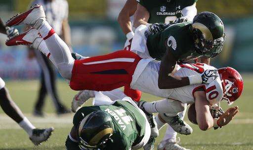 Fresno State quarterback Zach Kline, back, is tackled by Colorado State defensive backs Shun Johnson, left front, and Jordon Vaden in the second half of an NCAA college football game Saturday, Nov. 5, 2016, in Fort Collins, Colo. Colorado State won 37-0. (AP Photo/David Zalubowski)