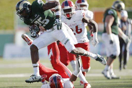 Colorado State running back Marvin Kinsey Jr., front, jumps over Fresno State defensive back Mike Bell for a long gain in the second half of an NCAA college football game Saturday, Nov. 5, 2016, in Fort Collins, Colo. Colorado State won 37-0. (AP Photo/David Zalubowski)