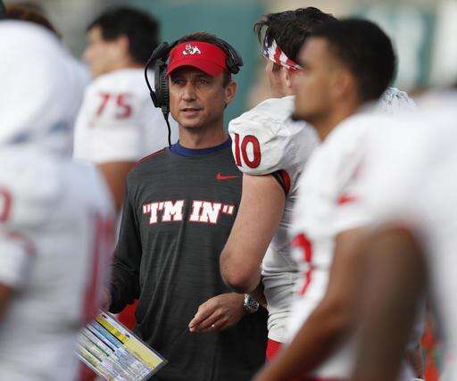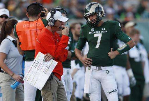 Colorado State head coach Mike Bobo, left, confers with quarterback Nick Stevens while facing Fresno State in the second half of an NCAA college football game Saturday, Nov. 5, 2016, in Fort Collins, Colo. Colorado State won 37-0. (AP Photo/David Zalubowski)