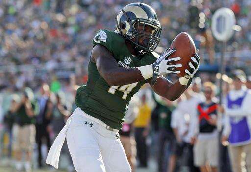 Colorado State wide receiver Anthony Hawkins pulls in a pass for a touchdown against Fresno State in the second half of an NCAA college football game Saturday, Nov. 5, 2016, in Fort Collins, Colo. Colorado State won 37-0. (AP Photo/David Zalubowski)