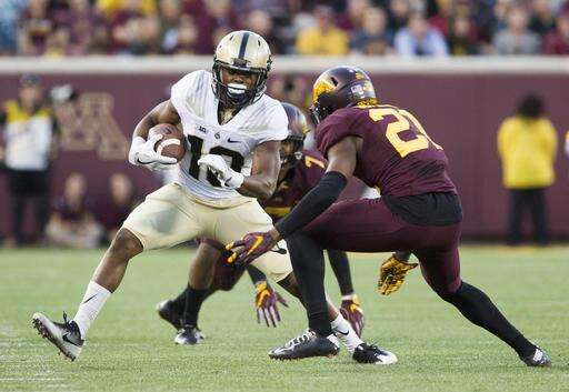 Purdue wide receiver DeAngelo Yancey (7) heads to the end zone on a 69-yard touchdown catch and run during the first half of an NCAA college football game against Minnesota, Saturday, Nov. 5, 2016, in Minneapolis. Minnesota defensive back Jalen Myrick (5) defends on the play. (AP Photo/Paul Battaglia) The Associated Press