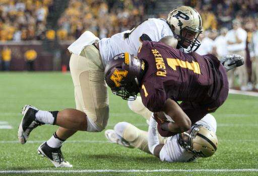 Purdue running back Markell Jones, left, is tackled by Minnesota defensive back Duke McGhee (8) after a nine-yard run during the second half of an NCAA college football game, Saturday, Nov. 5, 2016, in Minneapolis. (AP Photo/Paul Battaglia) The Associated Press