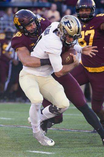 Purdue quarterback David Blough, front, is sacked by Minnesota linebacker Blake Cashman (36) during the first half of an NCAA college football game, Saturday, Nov. 5, 2016, in Minneapolis. (AP Photo/Paul Battaglia) The Associated Press