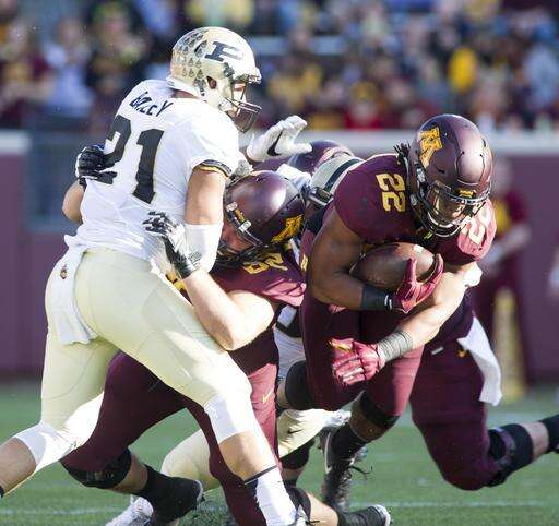 Minnesota: Smith topped the 100-yard mark for the fourth straight game and sixth time this season. . Gophers running back Shannon Brooks missed the game due to an unspecified injury. . Minnesota rushed for five touchdowns for the second straight game. . Sophomore Emmit Carpenter became the first Gopher in 19 years to kick two 50-yard field goals in a game. Carpenter converted from 52 and 53 yards in the first half. . Sophomore linebacker Blake Cashman, a walk-on filling in for two injured teammates, finished the game with two sacks.