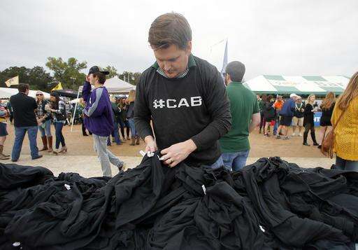 Jon McClellan of Houston surfs through a mound of shirts searching for a certain size before an NCAA college football game between TCU and Baylor on Saturday, Nov. 5, 2016, in Waco, Texas. The shirt has the word #CAB printed on them, and stands for Coach Art Briles, Baylor's former football coach. (AP Photo/Tony Gutierrez)
