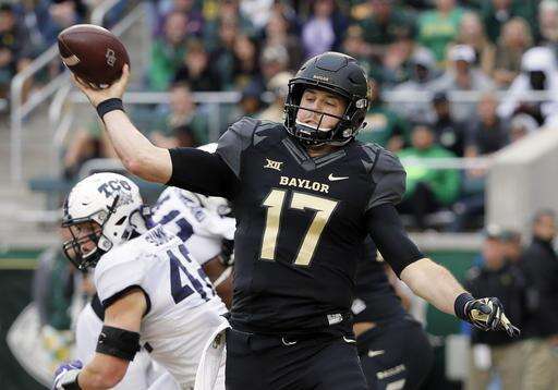 Baylor quarterback Seth Russell (17) throws a pass under pressure from Baylor safety Jairon McVea, rear, in the first half of an NCAA college football game, Saturday, Nov. 5, 2016, in Waco, Texas. (AP Photo/Tony Gutierrez)