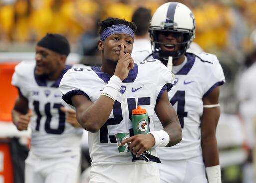 TCU wide receiver KaVontae Turpin (25) gestures his finger to his lips as he celebrates after teammate Ranthony Texada, not pictured, intercepted a Baylor Seth Russell pass and ran it back for a touchdown in the first half of an NCAA college football game, Saturday, Nov. 5, 2016, in Waco, Texas. (AP Photo/Tony Gutierrez)