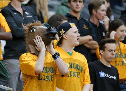 A Baylor fan wearing a horse mask and others react to a play against TCU in the first half of an NCAA college football game, Saturday, Nov. 5, 2016, in Waco, Texas. (AP Photo/Tony Gutierrez)
