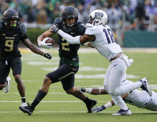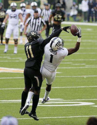 Baylor cornerback Jameson Houston (11) defends causing TCU wide receiver Emanuel Porter (1) to drop a pass from quarterback Kenny Hill in the first half of an NCAA college football game, Saturday, Nov. 5, 2016, in Waco, Texas. (AP Photo/Tony Gutierrez)