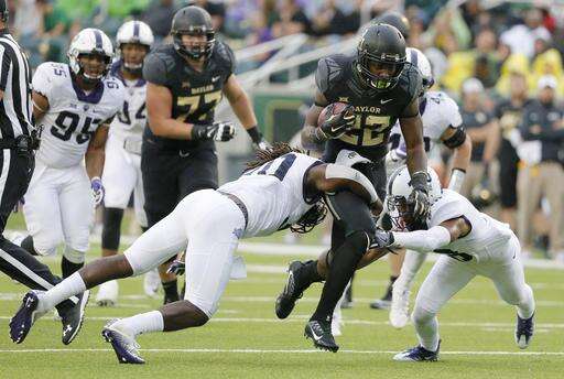 TCU running back Darius Anderson gets by a couple of tackle attempt by Baylor safety Orion Stewart (28) ad others running the ball in the first half of an NCAA college football game, Saturday, Nov. 5, 2016, in Waco, Texas. (AP Photo/Tony Gutierrez)