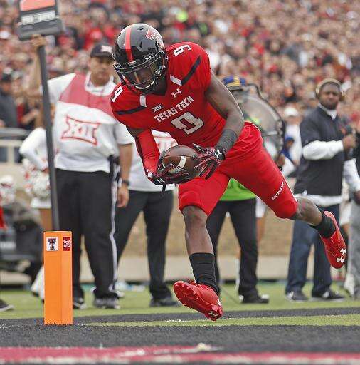 Texas Tech's Jonathan Giles (9) runs the ball into the end zone to score a touchdown during an NCAA college football game against Texas, Saturday, Nov. 5, 2016, in Lubbock, Texas. (Brad Tollefson/Lubbock Avalanche-Journal via AP)
