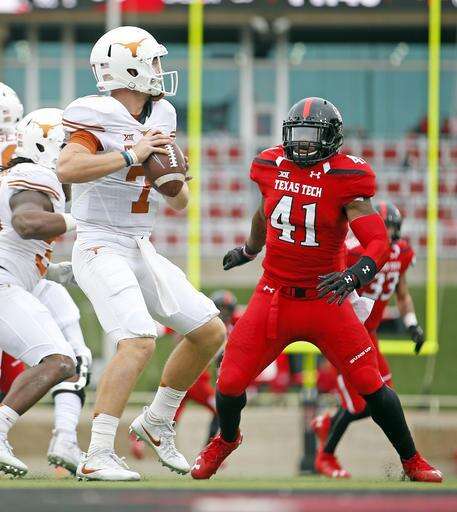 Texas' Shane Buechele (7) looks to pass the ball over Texas Tech's Malik Jenkins (41) during an NCAA college football game Saturday, Nov. 5, 2016, in Lubbock, Texas. (Brad Tollefson/Lubbock Avalanche-Journal via AP)
