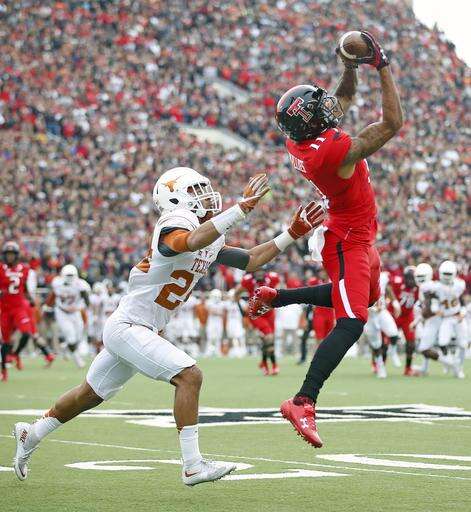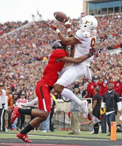 Texas' Collin Johnson (11) catches a touchdown pass over Texas Tech's Justis Nelson (31) during an NCAA college football game Saturday, Nov. 5, 2016, in Lubbock, Texas. (Brad Tollefson/Lubbock Avalanche-Journal via AP)