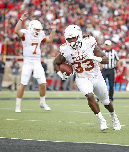 Texas' D'Onta Foreman (33) runs the ball into the end zone during an NCAA college football game against Texas Tech, Saturday, Nov. 5, 2016, in Lubbock, Texas. (Brad Tollefson/Lubbock Avalanche-Journal via AP)
