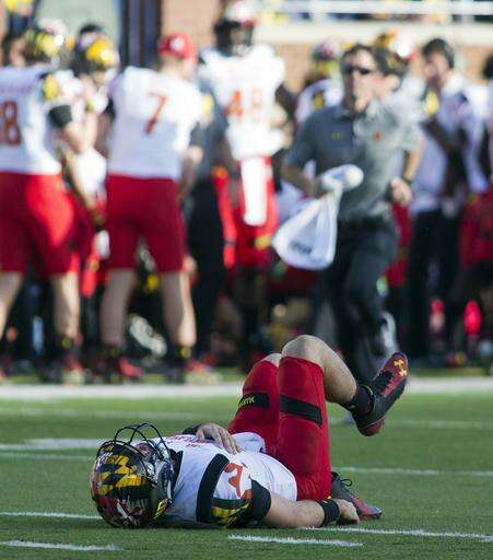 Maryland quarterback Perry Hills (11) struggles on the field after taking hit in the second quarter of an NCAA college football game against Michigan in Ann Arbor, Mich., Saturday, Nov. 5, 2016. Hills did not return the rest of the first half. (AP Photo/Tony Ding) The Associated Press