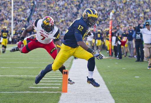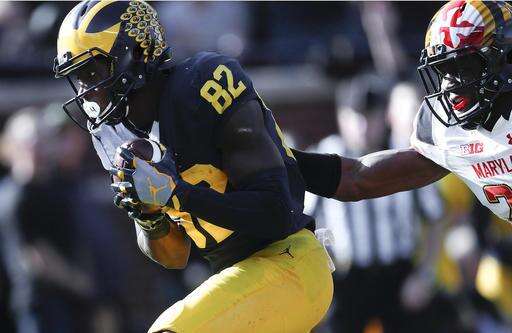 Michigan Wolverines wide receiver Amara Darboh (82) catches a 34-yard touchdown pass as Maryland Terrapins defensive back Alvin Hill (27) defends in the first half of an NCAA college football game in Ann Arbor, Mich., Saturday, Nov. 5, 2016. (AP Photo/Paul Sancya) The Associated Press