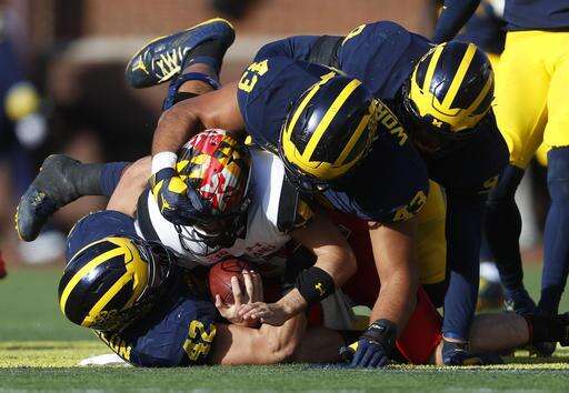 Maryland Terrapins quarterback Perry Hills is brought down for a loss by Michigan Wolverines linebacker Ben Gedeon (42), defensive end Chris Wormley (43), and Mike McCray (9) in the first half of an NCAA college football game in Ann Arbor, Mich., Saturday, Nov. 5, 2016. (AP Photo/Paul Sancya) The Associated Press