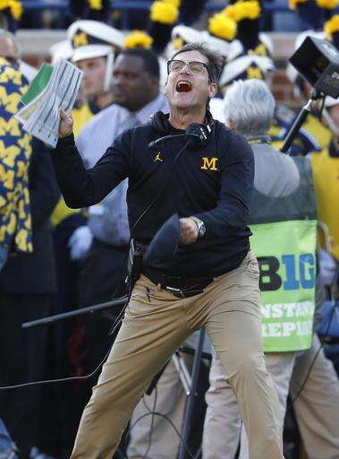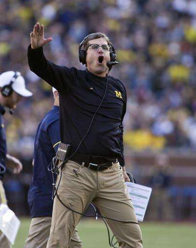 Michigan head coach Jim Harbaugh argues a call against the Maryland Terrapins in the first half of an NCAA college football game in Ann Arbor, Mich., Saturday, Nov. 5, 2016. (AP Photo/Paul Sancya) The Associated Press