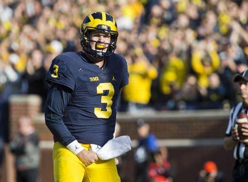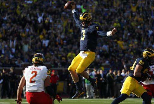 Michigan Wolverines quarterback Wilton Speight (3) scores on a 10-yard touchdown run against the Maryland Terrapins in the first half of an NCAA college football game in Ann Arbor, Mich., Saturday, Nov. 5, 2016. (AP Photo/Paul Sancya) The Associated Press