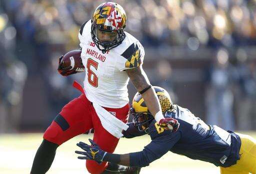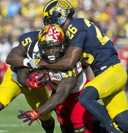 Maryland running back Kenneth Goins Jr. (30) is tackled by Michigan cornerback Jourdan Lewis (26) in the second quarter of an NCAA college football game in Ann Arbor, Mich., Saturday, Nov. 5, 2016. (AP Photo/Tony Ding) The Associated Press