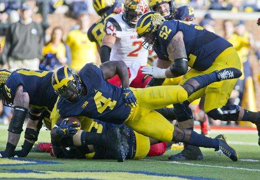Michigan running back De'Veon Smith (4) dives into the end zone for a touchdown in the second quarter of an NCAA college football game against Maryland in Ann Arbor, Mich., Saturday, Nov. 5, 2016. (AP Photo/Tony Ding) The Associated Press